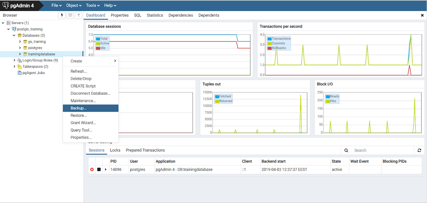 Tehdään varmistus koulutuskannasta pgAdmin-työkalun avulla. Valitse harjoitustietokanta ja valitse hiiren oikealla painikkeella Backup…-toiminto: