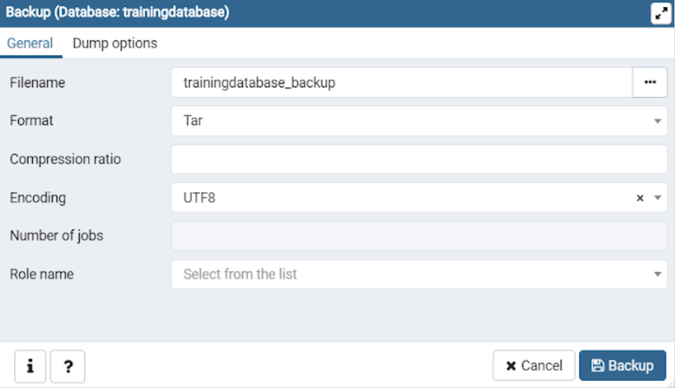 Täytä avautuvaan Backup-ikkunaan tiedoston nimeksi “trainingdatabase_backup”, formaatiksi Tar ja koodaukseksi UTF8.