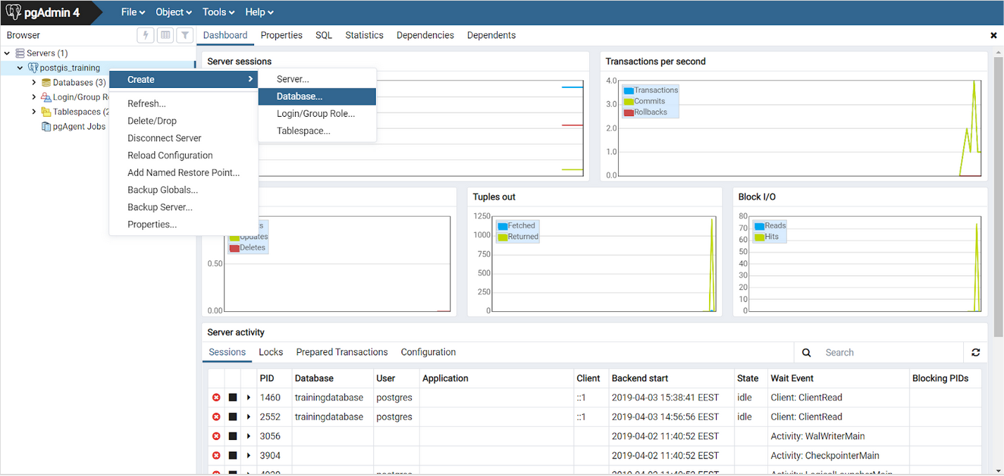 Klikkaa hiiren oikeaa nappia tietokantaklusterin päällä ja valitse Create > Database…. Anna tietokannalle nimeksi “trainingdatabase2”.
