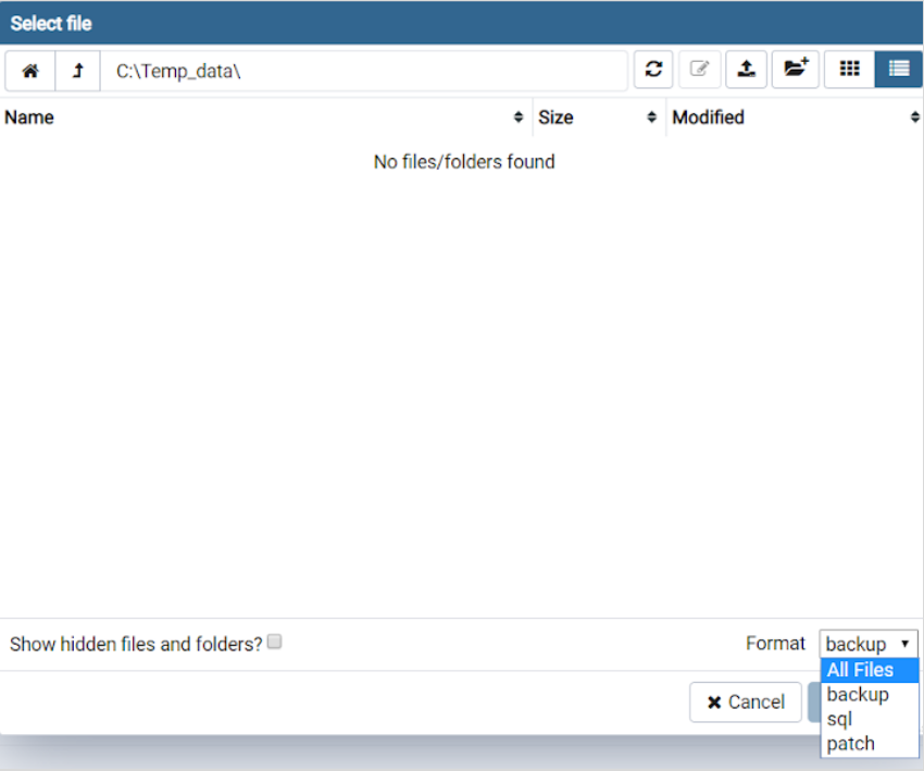 Jos varmistustiedostoa ei meinaa löytyä, valitse Select file -ikkunan oikean alanurkan Format-alasvetovalikosta formaatiksi All Files. Voit tarkastella palautettavia kohteita ennen palautusta Display Objects -toiminnon avulla.